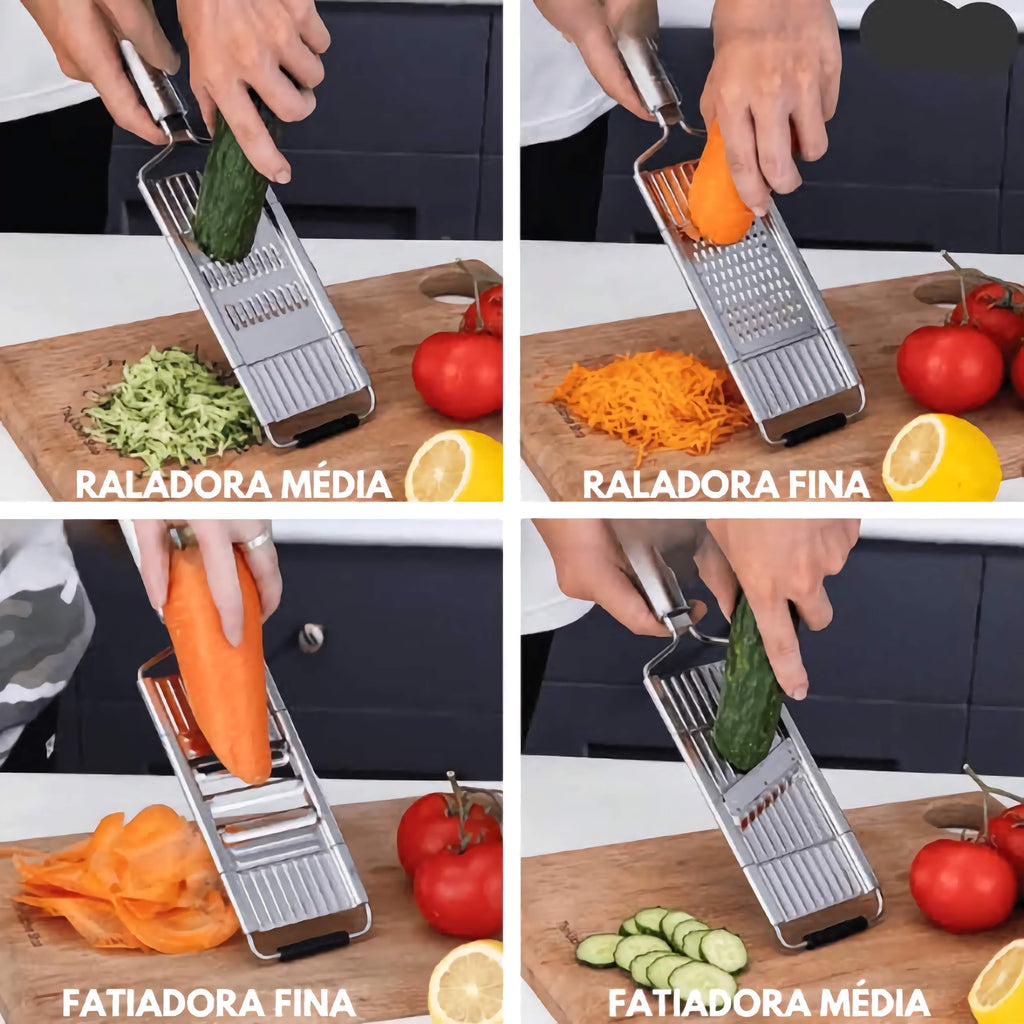 Este ralador multiuso em aço inox é o must-have da sua cozinha. Com 4 lâminas intercambiáveis, ele faz o trabalho de 5 raladores comuns em um só produto.